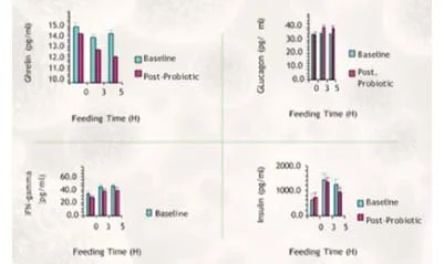 Markers for hunger (ghrelin), blood sugar (insulin and glucagon), and inflammation (IFN-gamma) improved in the treatment group.